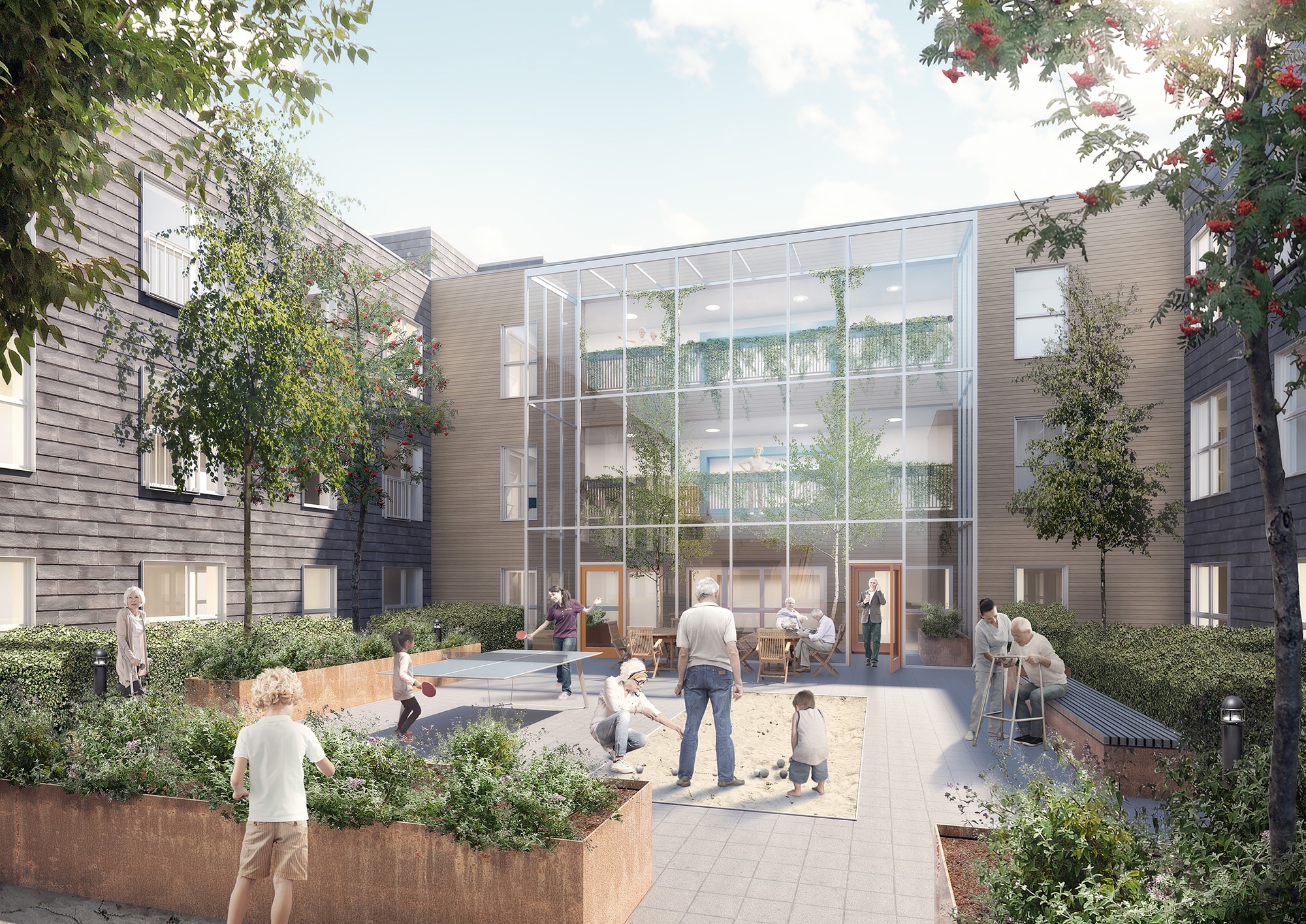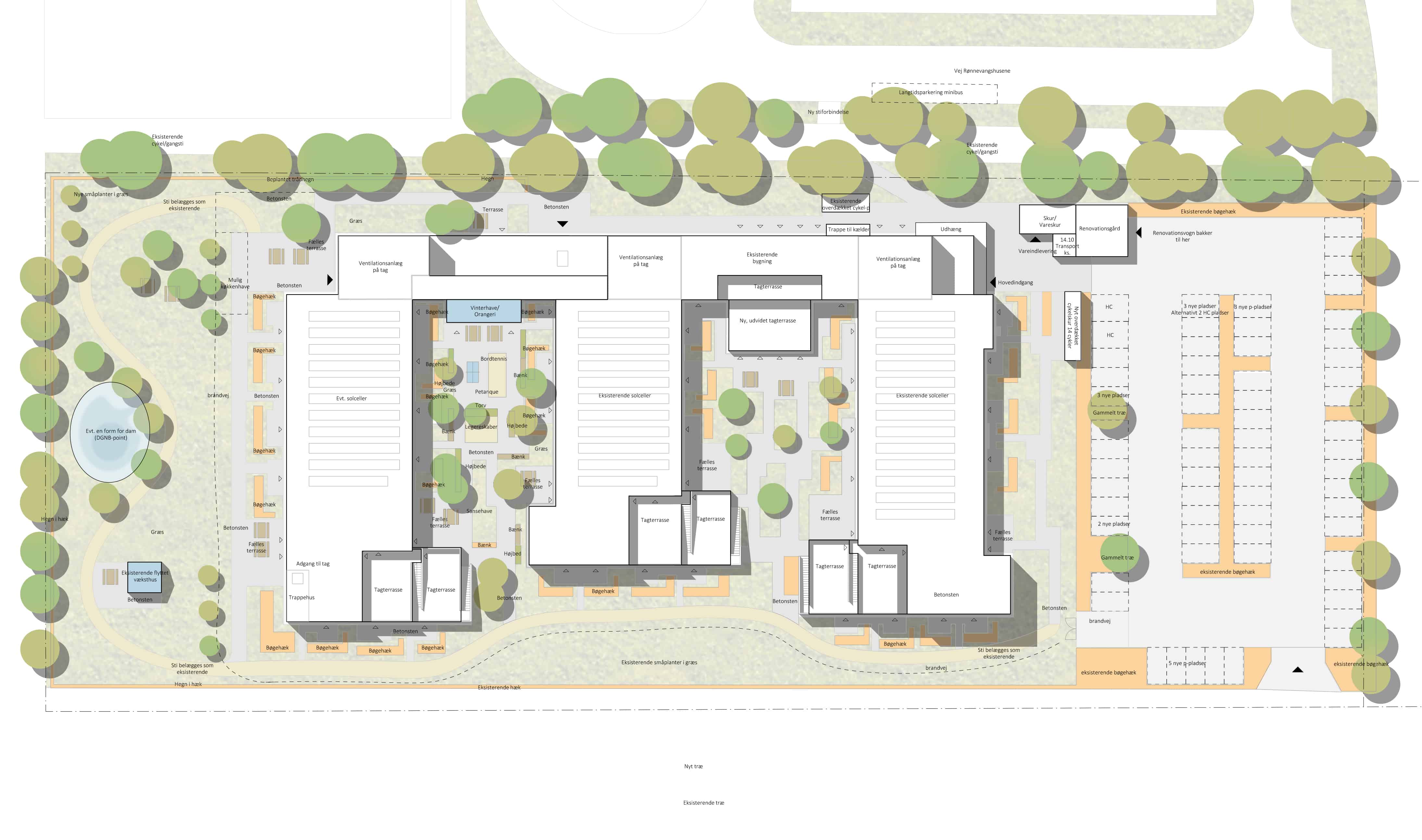Den første etape blev bygget som en U-form med fællesområder og servicearealer ”i bunden” og boliger i ”længerne”. Nu tilføjes der endnu en længe, så plejecenteret får en kam-form. Mellem længerne er der små private terrasser og hyggelige udearealer. Som noget nyt opføres der en form for orangeri i den nye etape.