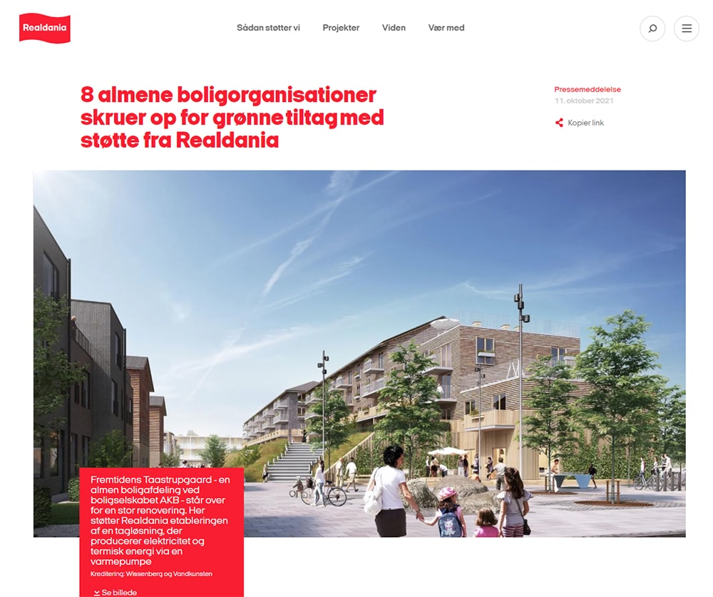 Realdania har offentliggjort de 11 grønne tiltag i 8 almennyttige boligselskaber, som får støtte til at blive gennemført. Det 11 tiltag er udvalgt på baggrund af granskning af 40 forskellige forslag til bæredygtighedstiltag, som en lang række almennyttige boligselskab fremsendte til Realdania tidligere på året.