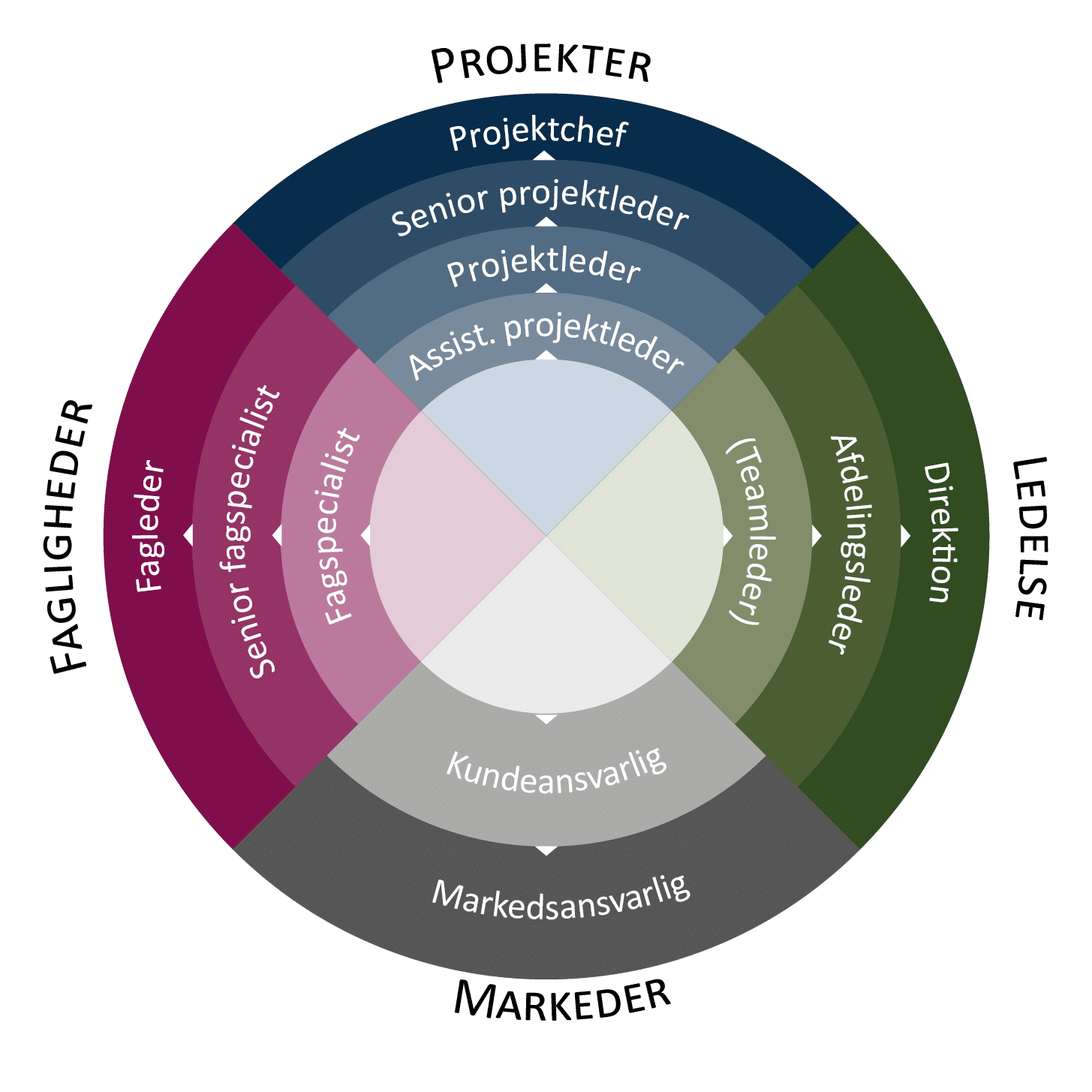 Med vores karrierekompas kan du se de typiske trin for udviklingen i en karriere hos os. Jo mere ansvar, du ønsker at påtage dig inden for dit felt, jo længere udad kommer du i kompassets cirkler.